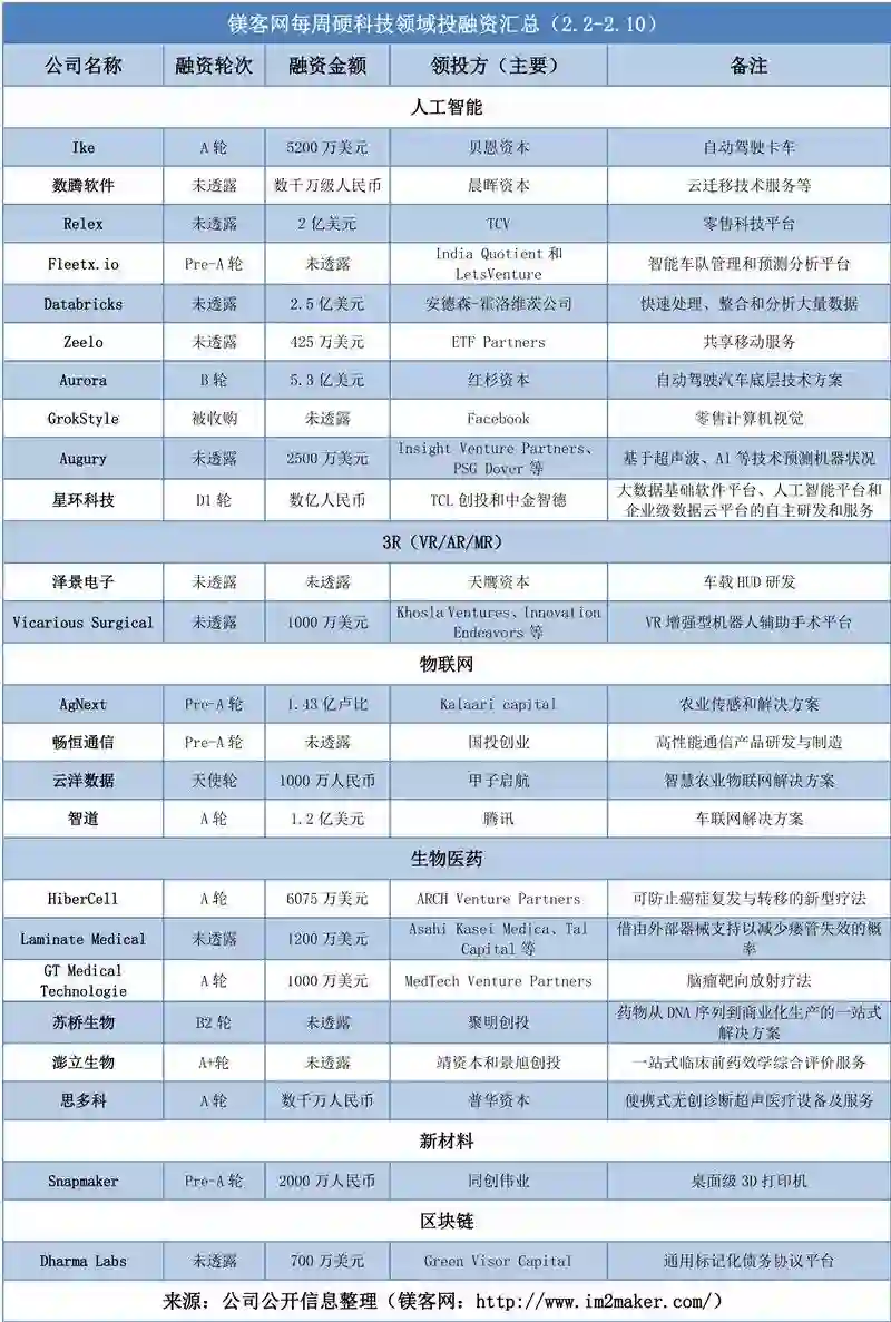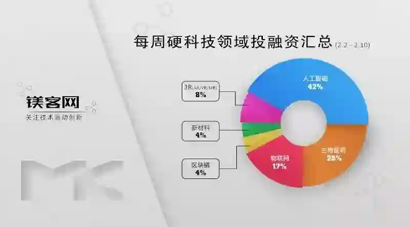 本周硬科技领域投融资事件一共24起,人工智能领域发生9起融资事件和1起收购事件,占比42%;生物医药领域发生6起融资事件,占比25%;物联网领域发生4起融资事件,占比17%;3R(VR/AR/MR)领域发生2起融资事件,占比8%;新材料和区块链领域分别发生1起融资事件,分别占比4%。