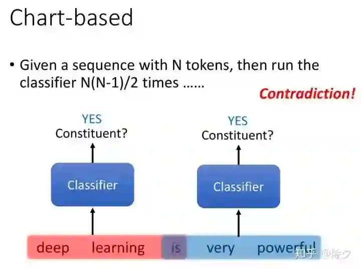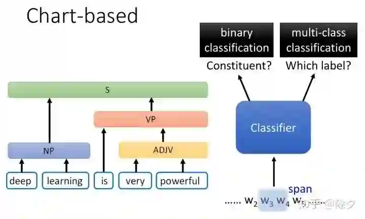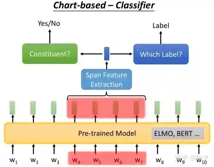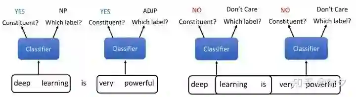成分句法分析通用的解决方案是怎样的呢?一个是 char-based 方案。我们训练一个分类器,输入是一串 tokens,它决定这个 span 是不是成分。如果确定它是成分,接下来我们要用另一个分类器,对该成分确定它的标签。