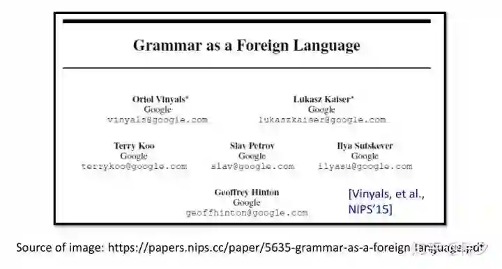 • [Vinyals, et al., NIPS’15] Oriol Vinyals, Lukasz Kaiser, Terry Koo, Slav Petrov, Ilya Sutskever, Geoffrey Hinton, Grammar as a foreign language, NIPS, 2015