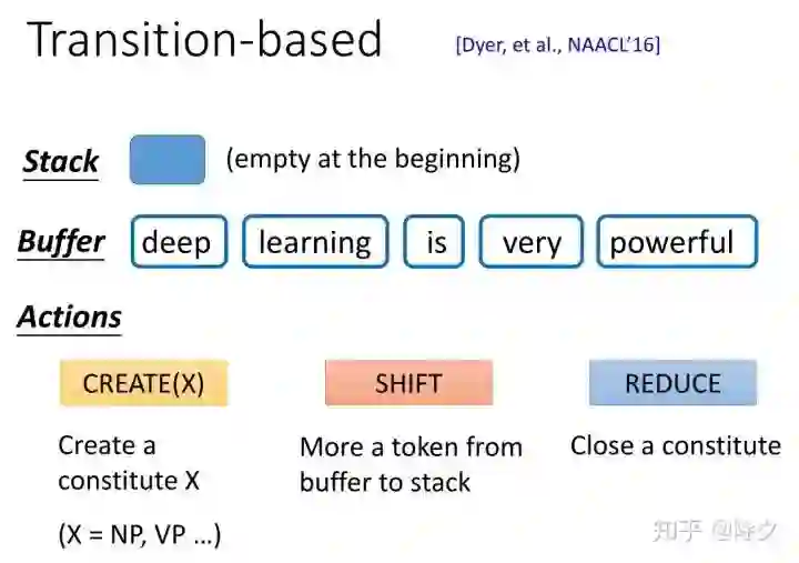 首先我们会有一个 Stack 数据结构 和 一个 Buffer。一开始,Stack 是空的,Buffer 里面则装有整个句子的 tokens。接着我们有三种候选操作,CREATE(x),表示创建一个成分,SHIFT,表示把Buffer 中的某个 token 放入 Stack 中。REDUCE,表示结束一个成分。