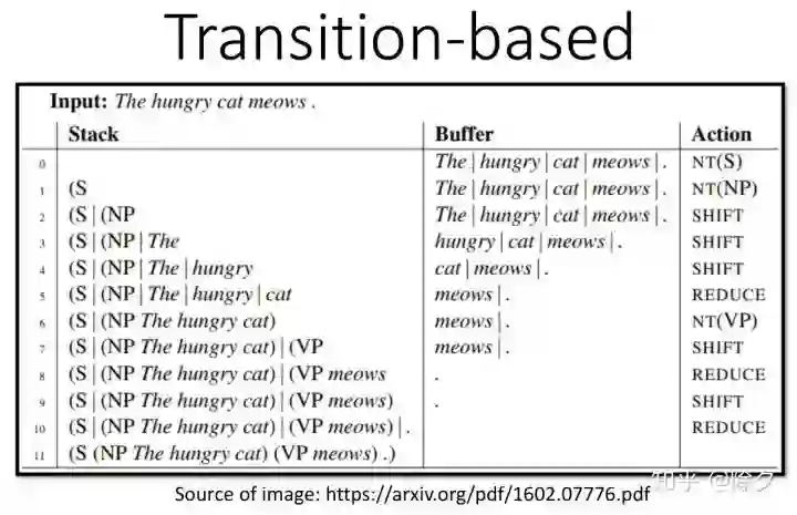 另一个方法叫作基于转移的方法。它的精神是把产生的句子加入到一个 Buffer 中,加上一连串的操作,就可以做到成分句法解析。我们接下来举一个实际例子说明。