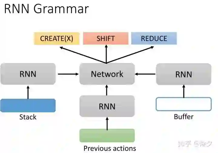 在以前是用一个 RNN 来决定要采取哪一个动作的。我们会把 Stack 中的内容和Buffer 中的内容,分别通过一个 RNN,再把之前的动作也通过一个RNN。这三个部分的特征相接后,再喂给一个网络做动作的分类。