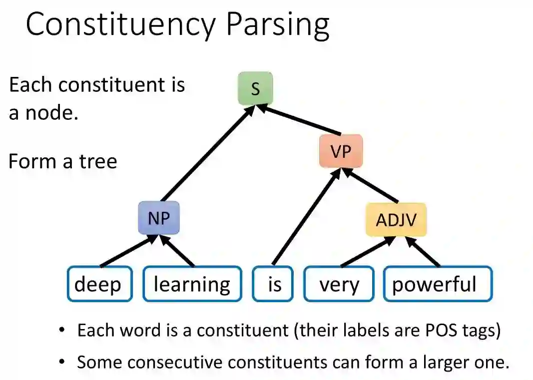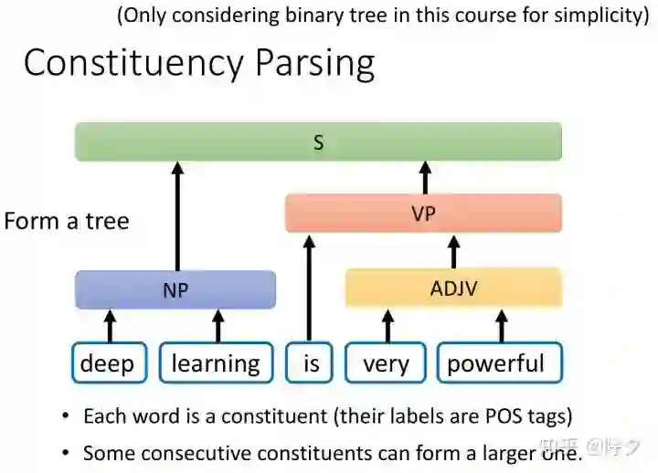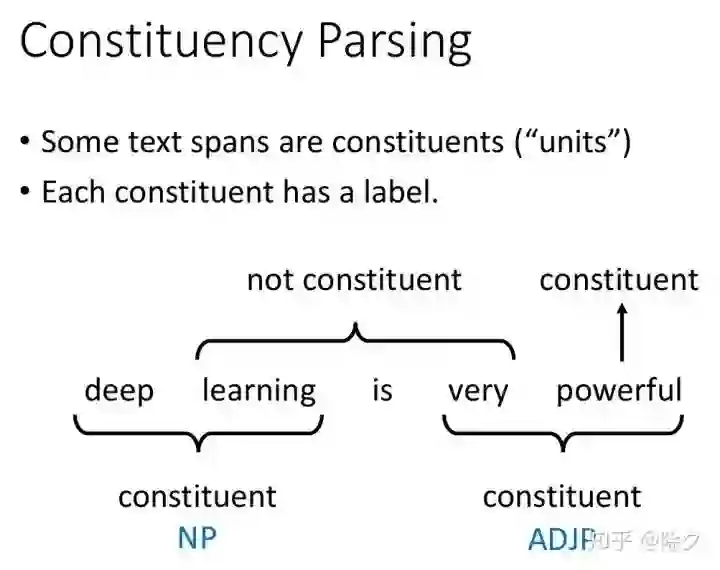 成分句法分析要做的是,给定一个句子,句子中每个词汇都是成分。它们的标签,就是它们的词性。接着,相邻的成分,可以组合成一个更大的单位。比如 deep 和 learning 可以组合起来成为一个名词短语。very 和 powerful 也可以组合起来,变成一个形容词短语。is 和 very powerful 又可以组合起来,变成一个动词短语。最后这个动词短语和名词短语组合起来,变成整个句子。