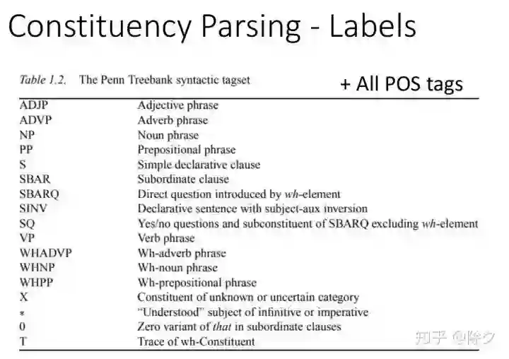 成分句法分析的标签类型还是比较多的。它的组成更倾向于是短语级别的。所有词性标注的词项标签也都是可能的标签。