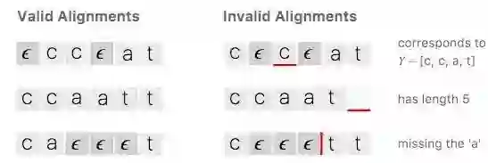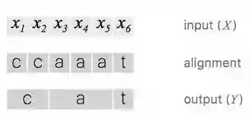 为了激发CTC的特定形式,我们可以实验一个简单的例子。假设输入X长度为6,输出Y=[c, a, t],那么对齐X和Y的一种有效方法是为每个输入长度分配一个输出字符并重复collapse: