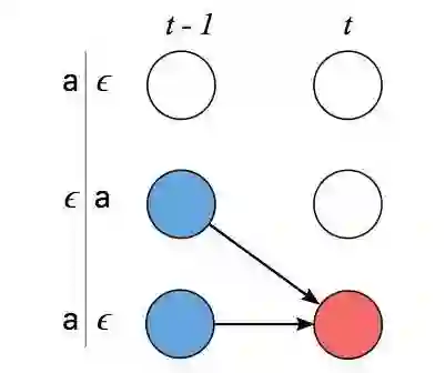 如上图所示,在这种情况下,我们不能跳过zs−1,它是Z之前的标记内容,所以可能是一个映射Y。由于之前我们设Z=[ϵ, y1, ϵ, y2,…,ϵ, yU, ϵ],每个Y前后都有一个blank,因此可以推断出zs=ϵ,同理,zs=zs−2。