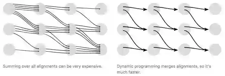 值得庆幸的是,我们能用动态规划算法快速计算loss,其关键思路是如果两种路径用相同步长映射到同一输出,那它们就能被合并。