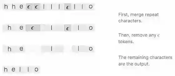 如果Y在同一行中的相邻位置有两个相同的字符,为了做到有效对齐,它们之间必须插入一个空白符号ϵ。有了这个规则,模型才能准确区分collapse到“hello”的路径和collapse到“helo”的路径。