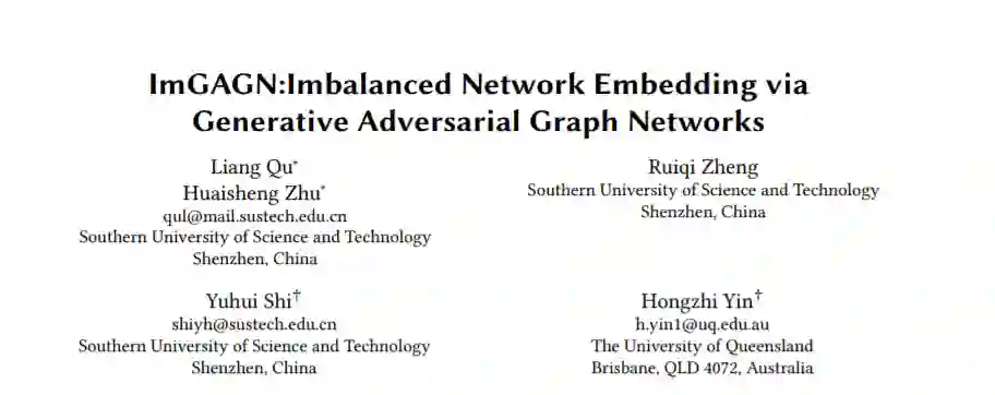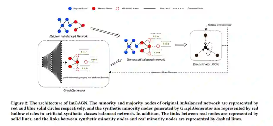图上的不平衡分类是普遍存在的,但在许多现实世界的应用(如欺诈节点检测)中具有挑战性。近年来,图神经网络在许多网络分析任务中显示出良好的性能。然而,现有的GNN大多只关注平衡网络,在不平衡网络上的性能不理想。为了弥补这一缺陷,本文提出了生成式对抗图网络模型ImGAGN来解决图上的不平衡分类问题。介绍了一种新的图结构数据生成器GraphGenerator,它可以通过生成一组合成的少数节点来模拟少数类节点的属性分布和网络拓扑结构分布,从而使不同类中的节点数量达到均衡。然后训练一个图卷积网络(GCN)识别器来区分合成平衡网络上的真实节点和虚假节点(即生成节点),以及少数节点和多数节点。为了验证该方法的有效性,在四个真实的不平衡网络数据集上进行了大量的实验。实验结果表明,在半监督不平衡节点分类任务中,该方法优于现有的算法。