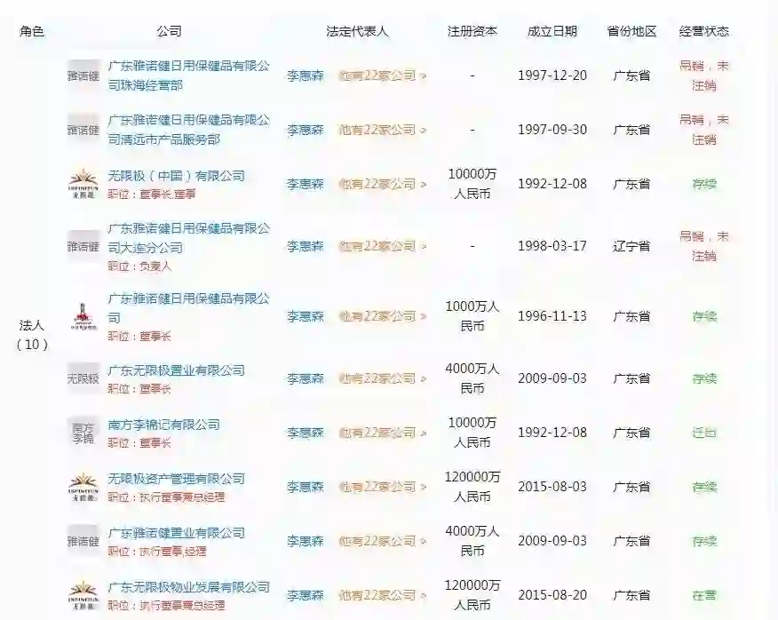 天眼查资料显示,李惠森作为法定代表人的企业有10家,其中3家已经吊销。