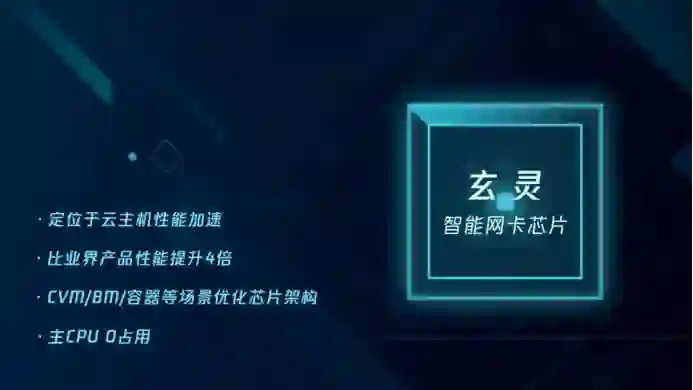 玄灵智能网卡芯片定位于云主机的性能加速,结合 CVM / BM /容器等场景优化芯片架构,将原来运行在主 CPU 上的虚拟化、网络/存储 IO 等功能下移到芯片,实现了主 CPU 的零占用,性能相比业界产品提升了 4 倍。