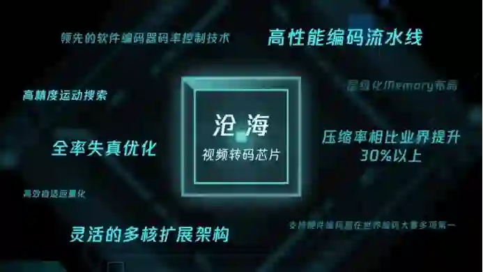 沧海视频转码芯片在算法上完整实现了高精度运动搜索、全率失真优化、高效自适应量化等所有主流编码工具,并融合了腾讯云软件编码器码率控制等方面的领先技术,目前压缩率相比业界提升 30% 以上。