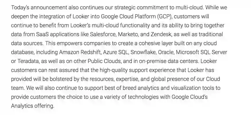 不难看出,谷歌方面 认为 这起收购符合其坚持的 多云战略,用户将继续从 Looker 多云平台提供服务的方式中受益,并继续享受到不同云平台在数据方面提供的能力。同时,谷歌的 BigQuery 数据分析引擎将与 Looker 进行集成,为用户提供更快、更具可操作性的数据洞察力,这将有助于推动业务发展并更好地为客户服务。