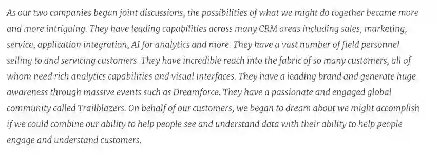 综上,在这场商业行为中,双方显然都找到了利好的部分。虽然华尔街认为 Salesforce 付出的价格过高导致其收购当天的股票下跌,但也有 观点 表明可以参照 Facebook 对 Instagram 的收购,当年的 Facebook 也因为同样的问题受到指责,但如今 Instagram 的价值 为 1000 亿美元,其投资回报率为 100 倍,同样的事情也可能发生在 Salesforce 身上。不论如何,BI 的价值开始被商业和资本关注。