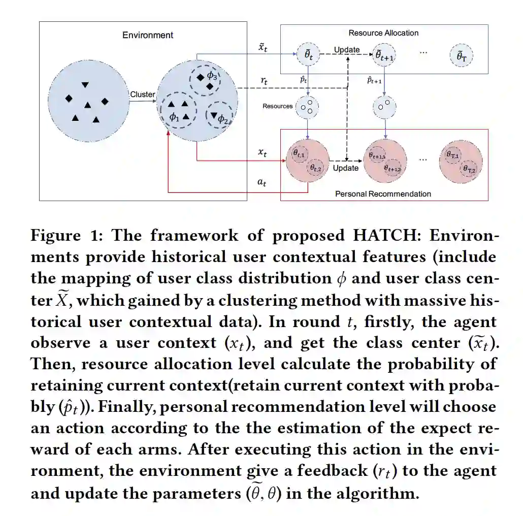 摘要:上下文多臂 bandit(MAB)在各种问题上实现了优异性能。然而,当涉及到推荐系统和在线广告等现实场景时,必须考虑探索的资源消耗。在实践中,通常存在与在环境中执行建议(ARM)相关联的非零成本,因此,应该在固定的探索成本约束下学习策略。由于直接学习全局最优策略是一个NP难题,并且极大地使bandit算法的探索和开发之间的权衡复杂化,因此直接学习全局最优策略是一个很大的挑战。现有的方法着重于通过采用贪婪策略来解决问题,该策略估计预期的收益和成本,并基于每个臂的预期收益/成本比使用贪婪的选择,利用历史观察直到勘探资源耗尽为止。然而,现有的方法当没有更多的资源时,学习过程就会终止,因此很难扩展到无限的时间范围。本文提出了一种分层自适应上下文bandit方法(HATCH)来进行有预算约束的上下文bandit的策略学习。HATCH采用一种自适应的方法,根据剩余资源/时间和对不同用户上下文之间报酬分配的估计来分配勘探资源。此外,我们利用充分的上下文特征信息来找到最好的个性化推荐。最后,为了证明提出的理论,我们进行了regret bound分析,并证明HATCH的regret bound低至O(√T)。实验结果证明了该方法在合成数据集和实际应用中的有效性和效率。