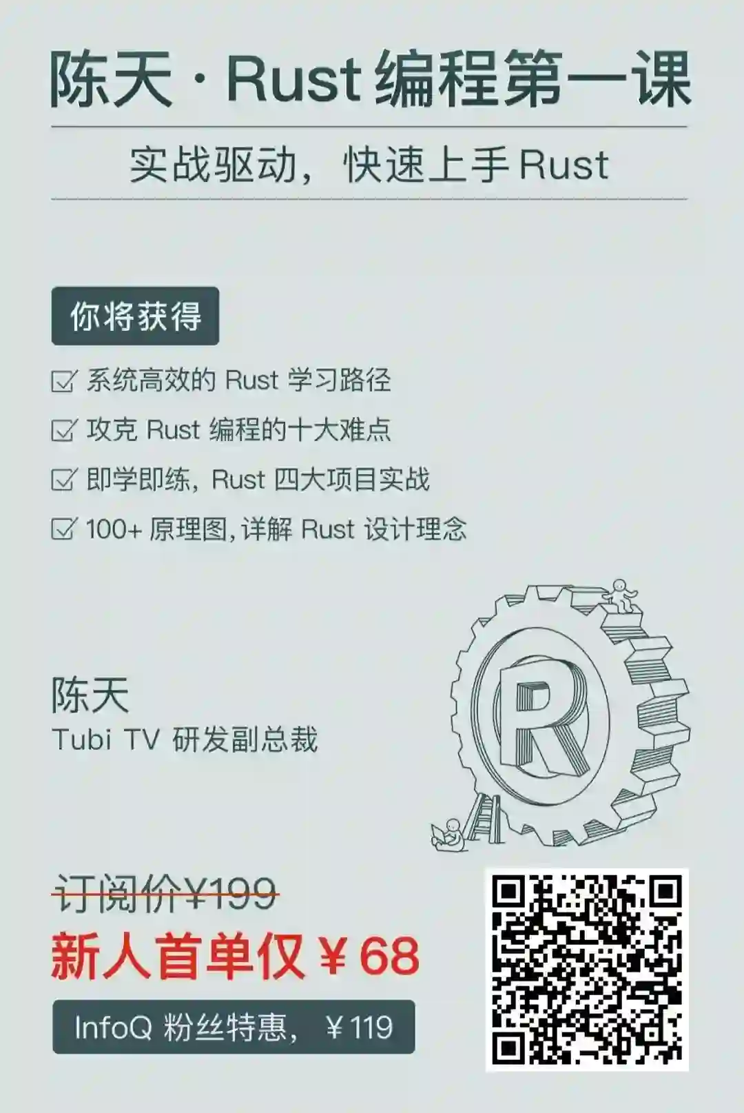 后来,我和极客时间合作推出了《陈天 · Rust 编程第一课》专栏。我希望能通过这个专栏,给你一个系统的 Rust 的入门路径,由浅入深,帮助你攻克 Rust 的主要难点,理解其设计理念: