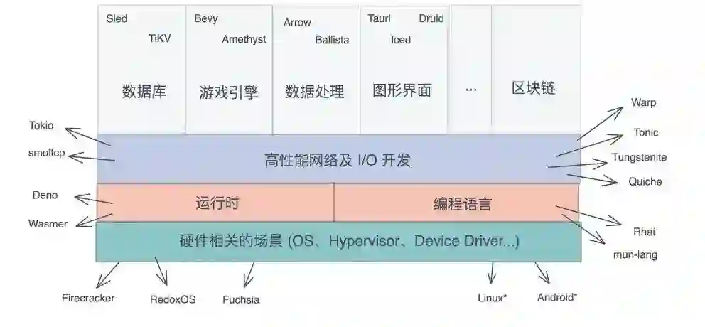 所以,集表达力、高性能、内存安全于一身的 Rust ,在很多场景里都能大施拳脚。除了在传统的系统开发领域,如操作系统、设备驱动、嵌入式等方向高歌猛进之外,Rust 还在服务端高性能、高并发场景遍地开花。