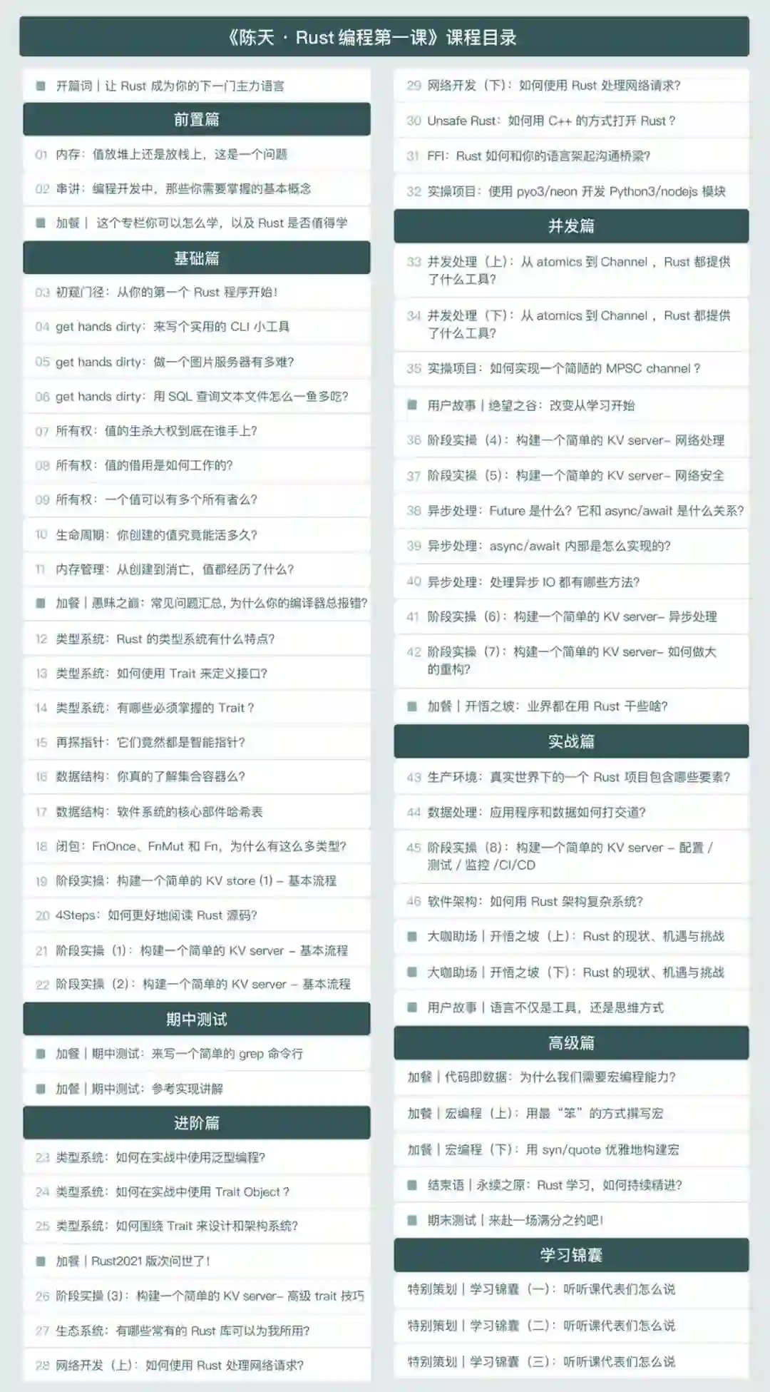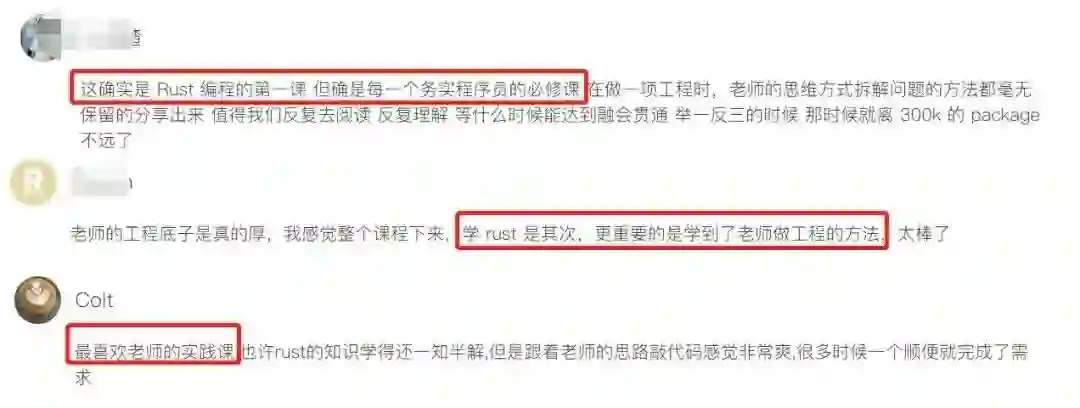 所以专栏每一模块都设计了实践内容,带你把 Rust 应用在生产环境中,以及用 Rust 解决实际问题。我拆解问题的方法也分享给大家,建议反复阅读、理解。