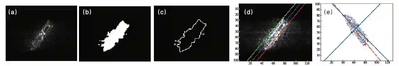 图5为海面舰船目标ISAR图像的识别流程。对于舰船目标原始图像(图5(a)),首先利用阈值分割的方法对目标进行分割结果(图5(b)),接着对分割后的图像进行轮廓提取、中心先检测及尺寸估计等特征提取,分别如图5(c)~(e)所示,基于SVM分类方法利用特征向量进行训练,获取训练特征分类器;最后对测试样本提取特征输入分类器获取分类结果。