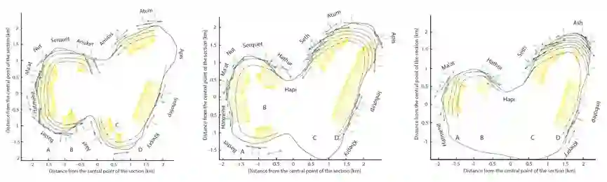 多视角的地层和重力方向关系,黄色为重力方向,虚线为地层位置,两者几乎处处近乎垂直。图片来源:文献[1]