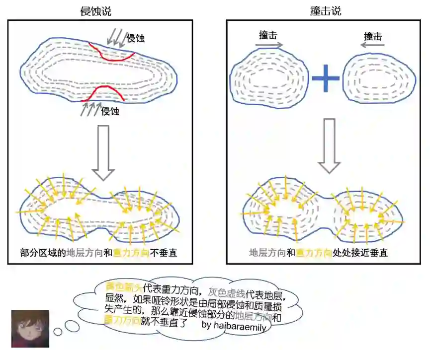 显然,侵蚀说和撞击说产生的地层特征应当是不同的。如果哑铃结构是由局部侵蚀产生的,那么靠近侵蚀部分的地层方向和重力方向就不垂直了。