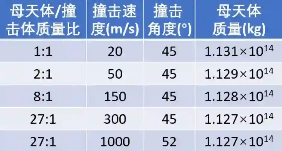 Schwartz及其同事们模拟了以下不同速度和质量比的多种灾难性撞击下母天体碎片的重吸积过程。