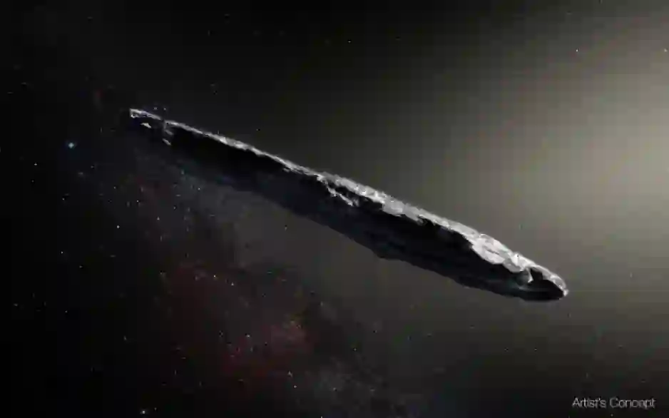 非要总结归类的话,也不是完全无迹可寻,最常用的标准就是长宽比啦。虽然同样是不规则形态,有些小天体长宽比小些,像个苹果;而有些长宽比大些,就像个芒果。更夸张的就是去年新发现的第一颗来自太阳系外的星际来客‘Oumuamua,长宽比高达10:1,假想图长这样: