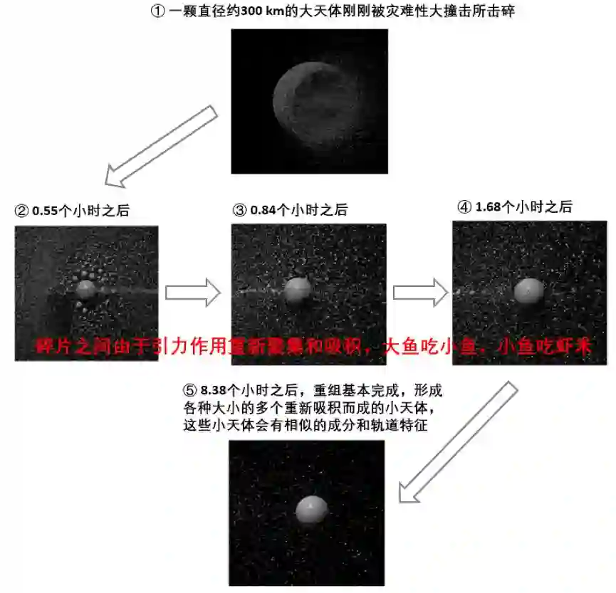 灾难性撞击之后碎片的重组过程。图片来源:参考文献[3] | 翻译:haibaraemily