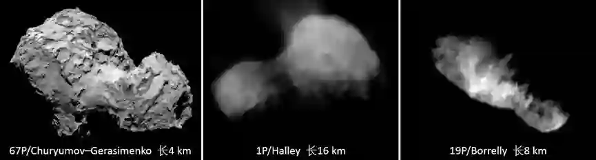 彗星67P/Churyumov–Gerasimenko(67P/楚留莫夫)、1P/Halley(也就是我们说的哈雷彗星)、19P/Borrelly都是有名的哑铃型小天体。图片来源:NASA