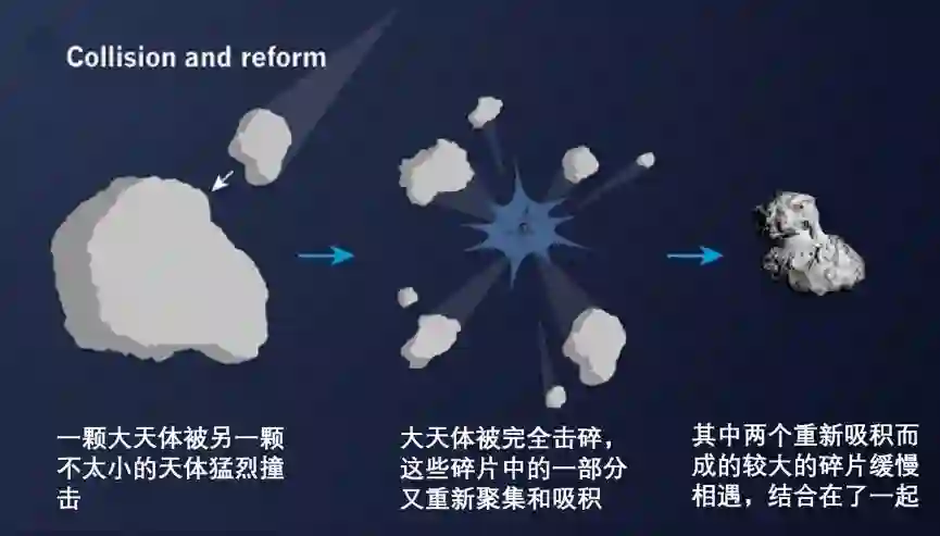 这类哑铃型小天体是如何形成的?多年以来一直是科学家们争议的话题。有两种猜测。一种是侵蚀说——一整块细长型小天体经过局部性的质量损失和风化侵蚀,最终变成了哑铃状;一种是撞击说——两个小天体各自形成,然后因为碰撞而连接起来的。