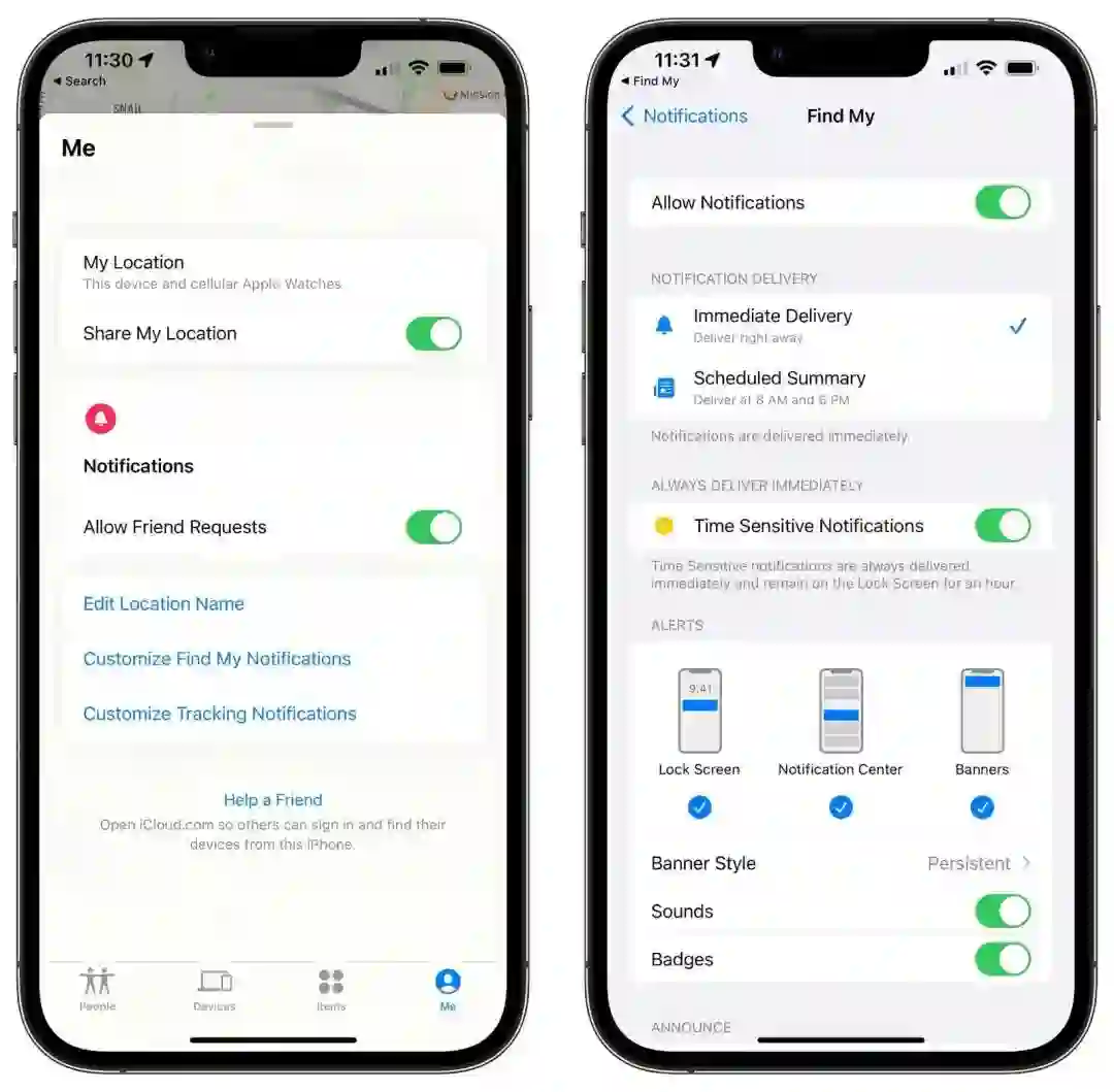 在当前的iOS 15.4 Beta 4测试版中,苹果针对信息传递的变化也做了一些小调整。在“查找”应用中,不再有开关关闭“物品安全警报”的选项,而苹果提供了“自定义查找通知”和“自定义跟踪通知”选项。