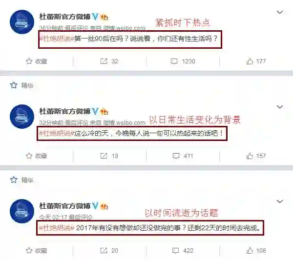 从与避孕套等核心产品有关的广告话题,到情感、两性的用户话题,再到贴近生活的日常话题,杜蕾斯总能找到或有趣或新奇或扎心的切入点,以简单的几句文案作话题引导,或引发粉丝共鸣、或刺激粉丝的好奇心与探知欲、或勾起粉丝的表现心理,从而让消费者积极、主动地、踊跃地进行回复和讨论。