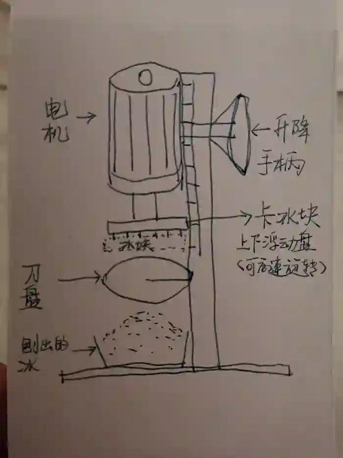 “他(张红超)就买了一个电机,自己焊了一个架子,架子上装了升降调节螺纹,电机的一头焊接上卡冰块的转盘,转盘下面自做了一个刀盘,一台刨冰机就造出来了。”