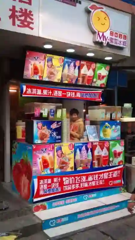 “那是一个只有两平方米左右的橱窗,进去最里面是一台冰柜,靠着窗口是一张桌子,桌子上面一台刨冰机......除掉这些设备之外,里面做产品的位置大概能站下两人。吊扇旁边挂着一个磁带随身听,随身听有一根线,连着一个声音特别大的音箱放着呼呼通通的流行音乐”。