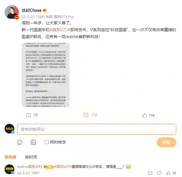 realme 真我中国区总裁徐起今日在微博上宣布将推出新一代国潮手机“真我 V25”。他表示 V 系列定位“科技国潮”,这一次不仅有非常重磅的国潮 IP 联名,还将有一项 realme 首款新科技!”此外,徐起还表示,realme 要做年轻人最喜爱的科技潮牌,希望国潮能在科技行业继续绽放,更希望国潮能在国门之外走得更远。