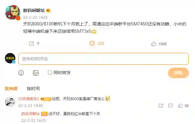 据 @数码闲聊站 今日爆料,天玑 8000/8100 新手机下个月上市,高通中端新平台 SM7450 还没有动静,小米的轻薄中端机接下来还继续用 SM73x5。据悉,天玑 8000 采用台积电 5nm 工艺,具有 4 个 2.75GHz 的 A78 大核和 4 个 2.0GHz 的 A55 小核,GPU 为 Mali-G510 MC6,最高支持 FHD+168Hz 和 QHD+120Hz 屏幕,还支持 LPDDR5 和 UFS 3.1。不过,由于频率有些保守,因而 3 月 1 号还有高频版天玑 8100 芯片一起发,有些厂商还将原定的天玑 8000 换成了天玑 8100。