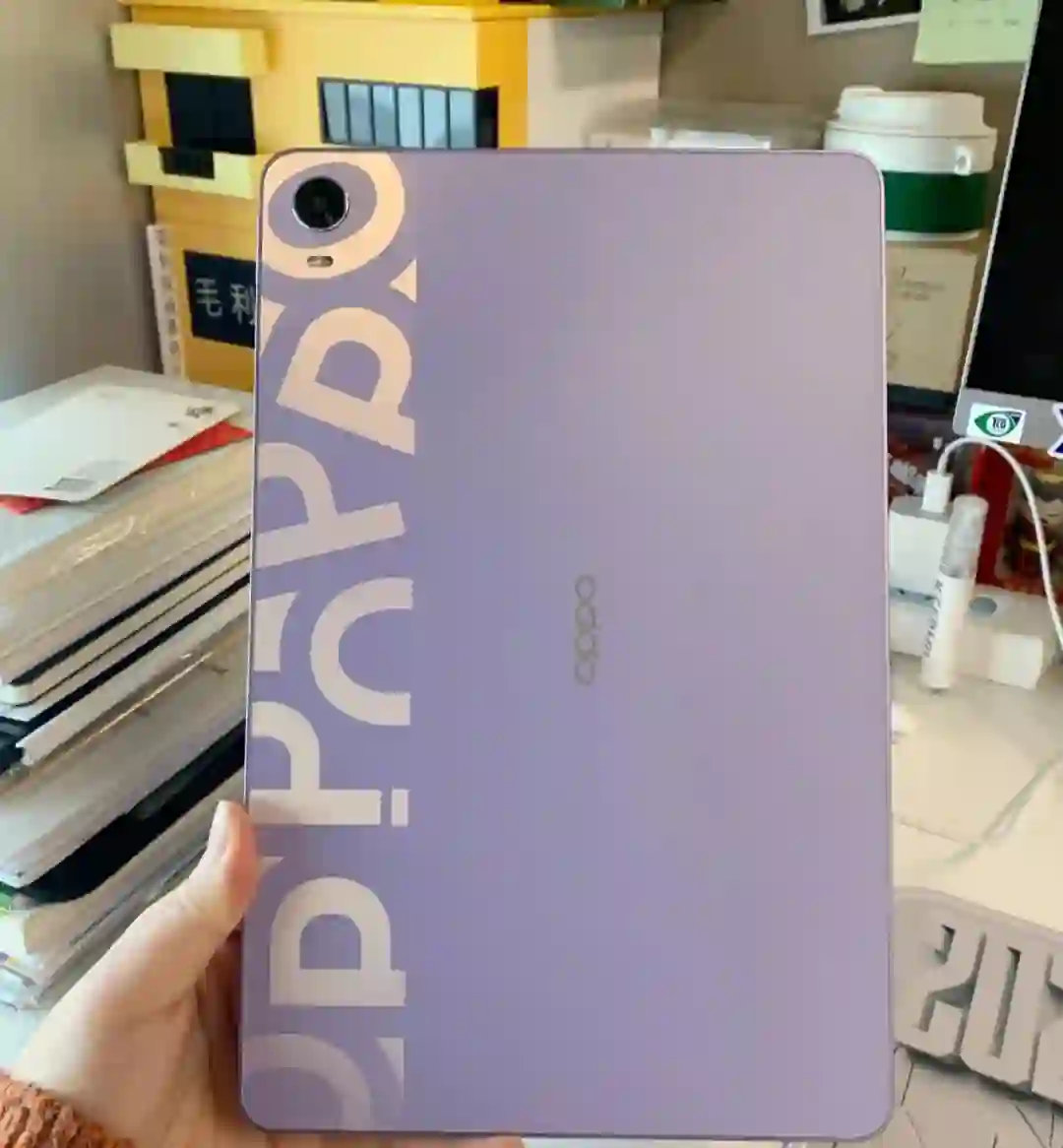 OPPO 官方已经提前释出了 OPPO Pad 紫色版的外观设计。可以看到,这款平板除了采用淡紫色作为主色调以外,背面还加入了 O、P 英文字母设计而成的底纹,整体的外观辨识度颇高。不仅如此,这款 OPPO Pad 还拥有专属的实体键盘,屏幕四边等宽,且机身采用了直角边框设计。