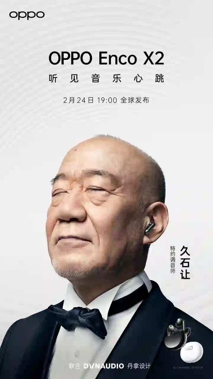 OPPO 预热新一代旗舰真无线耳机 Enco X2,这款耳机由日本音乐人、作曲家、钢琴家久石让进行调音。这款耳机为入耳式,而且联合丹拿设计。另外,从预热海报了解到,其还采用第二代同轴双单元发声架构,具有 Hi-Res Audio Wireless 超清音质传输、LHDC 4.0 超清音质传输、超宽频深度降噪等特性。