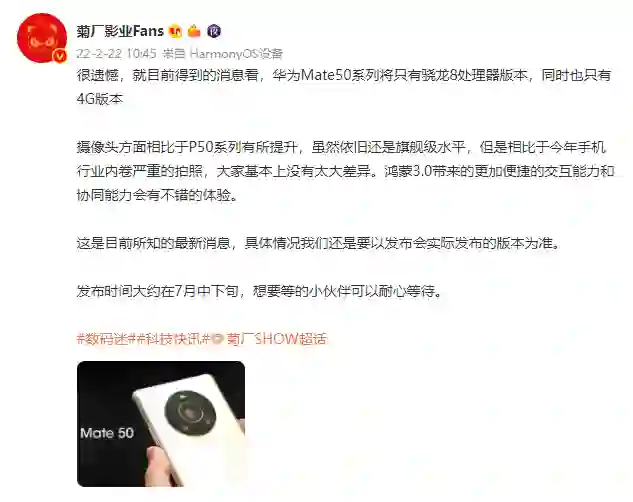 数码博主 @菊厂影业Fans 今日发文表示,就目前得到的消息看,华为 Mate 50 系列将只有骁龙 8 处理器版本,同时也只有 4G 版本。摄像头方面相比于 P50 系列有所提升,虽然依旧还是旗舰级水平,但是相比于今年手机行业内卷严重的拍照,大家基本上没有太大差异。鸿蒙 3.0 带来的更加便捷的交互能力和协同能力会有不错的体验。另外,该机发布时间大约在 7 月中下旬。