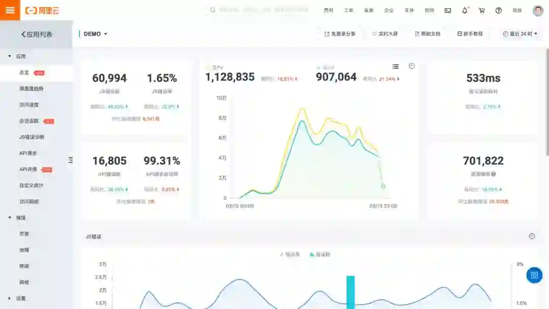 2017 年 9 ⽉,retcode 升级为阿⾥云 ARMS 前端监控,开启全⽹公测。在直⾯⾏业竞争对⼿的同时,我们的多项核⼼能⼒得到极⼤提升,这其中包括⾯向全球化业务的国际极致性能、JS Error 出错时⽤户⾏为回溯、API 接⼝快照以及打通前后端的全链路追踪等等,前端监控平台也经历了从“错误数据展示”到“专家级问题诊断”的升级,整个平台每天处理的⽇志条数也超过了百亿级别。