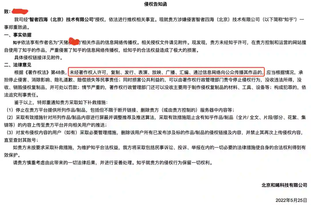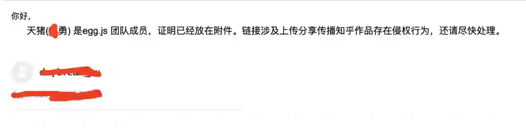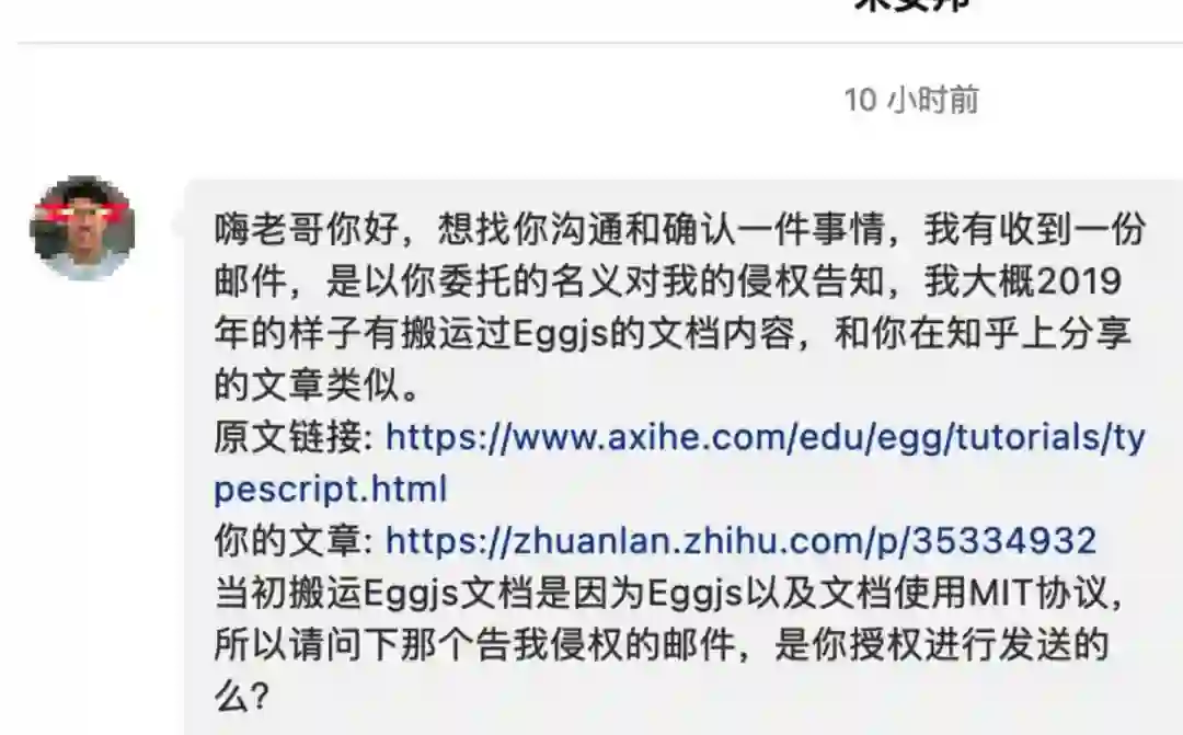 5 月 26 日,网友“an168bang521” 在 V2EX 上发布了一篇标题为“想问下懂法律的老哥们,摘抄阿里开源软件 Egg.js 技术文档内容算不算侵权”的帖子,声称自己收到了一个知乎用户的委托公司的邮件,被告知其网站擅自使用了知乎的作品,侵犯了知乎的信息网络传播权,并要求采取相关的补救措施。