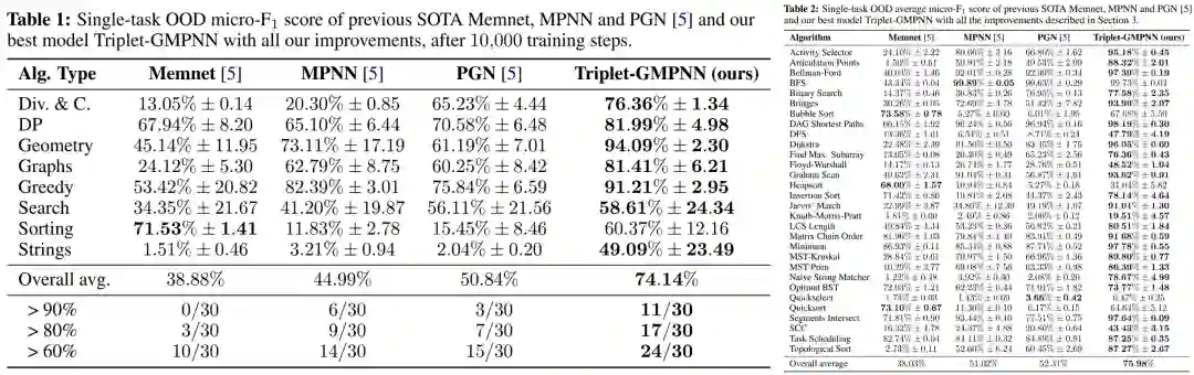 对模型改进之后得到一组超参数模型,经过训练,该模型在 CLRS-30 上达到了 SOTA 性能。下表 1 和表 2 显示了包括 Memnet、MPNN、PGN 等模型在内的 micro-F_1 得分。