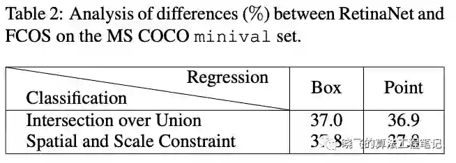 论文选取anchor-based方法RetinaNet和anchor-free方法FCOS进行对比,主要对比正负样本定义和回归开始状态的差异,将RetinaNet的anchor数改为1降低差异性,方便与FCOS比较,后续会测试anchor数带来的作用。