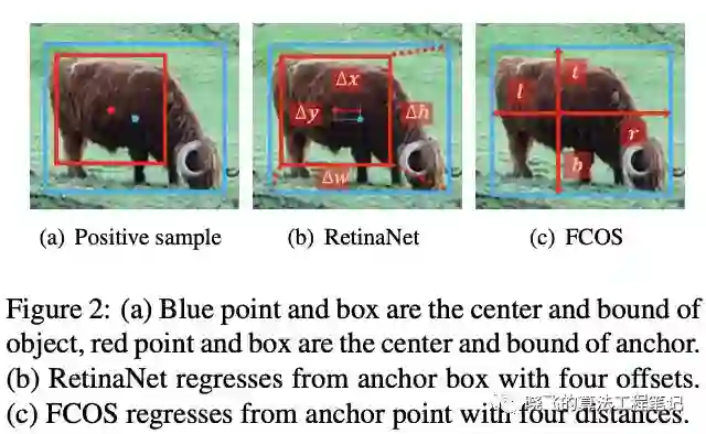 RetinaNet预测4个偏移值对anchor box进行调整输出,而FCOS则预测4个相对于anchor point值对anchor box进行调整输出