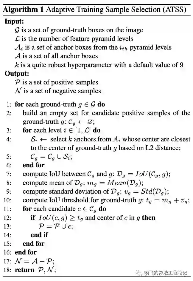 论文提出ATSS方法,该方法根据目标的相关统计特征自动进行正负样本的选择,具体逻辑如算法1所示。对于每个GT box
