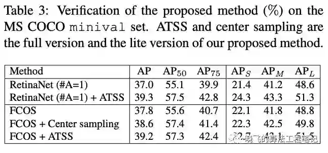 对上面的差异进行交叉实验,发现相同的正负样本定义下的RetinaNet和FCOS性能几乎一样,不同的定义方法性能差异较大,而回归初始状态对性能影响不大。所以,基本可以确定正负样本的确定方法是影响性能的重要一环。