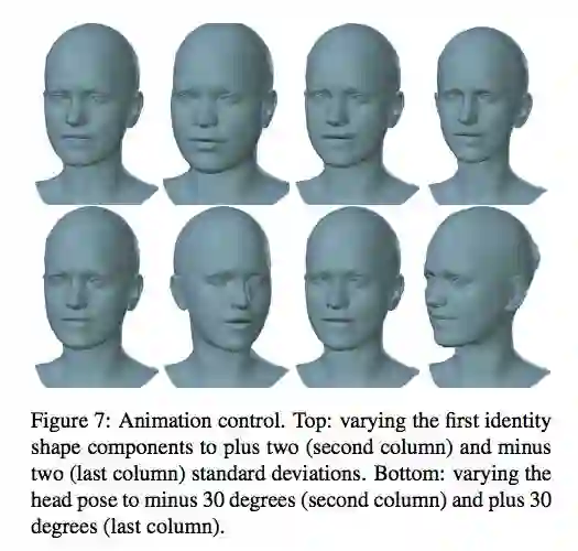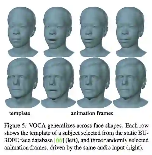 基于多个人物标签训练使得模型可以学习多种逼真的说话风格。在动图化的过程中,VOCA 还提供动图控制器来改变说话风格、依赖于人物的人脸形状和姿势(即头、下巴和眼球转动)。据我们所知,VOCA 是目前唯一无需重定位即可应用于未见人物的 3D 人脸动图模型。这使得 VOCA 适合比赛录像、VR 头像,或者任何无法提前知道说话者、语音和语言的场景。出于研究目的,我们公开了该数据集和模型,参见:http://voca.is.tue.mpg.de。(http://voca.is.tue.mpg.de./)