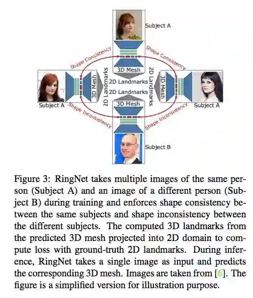 RingNet 在训练过程中使用人物 A 的多张图像和人物 B 的一张图像作为输入,然后识别出相同人物图像之间的形状一致性和不同人物图像之间的形状不一致性。