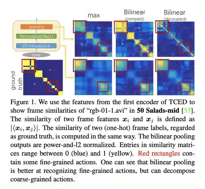摘要:细粒度时序动作解析在很多应用中都很重要,比如日常活动理解、人类动作分析、手术机器人等需要在较长时间段内具备精密准确操作的应用。这篇论文提出了一种新型双线性池化操作,它被用作时序卷积编码器-解码器网络的中间层。与其他研究不同,该双线性池化操作是可学习的,因此它能够比传统的操作捕捉到更多复杂的局部统计数据。