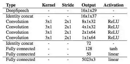 VOCA 用人物特定的模板 T 和原始音频信号作为输入,研究者利用 DeepSpeech [29] 从中提取特征。期望输出是目标 3D 网格。VOCA 是一个编码器-解码器网络,编码器学习将音频特征转换为低维嵌入,解码器将低维嵌入映射到 3D 顶点位移的高维空间。